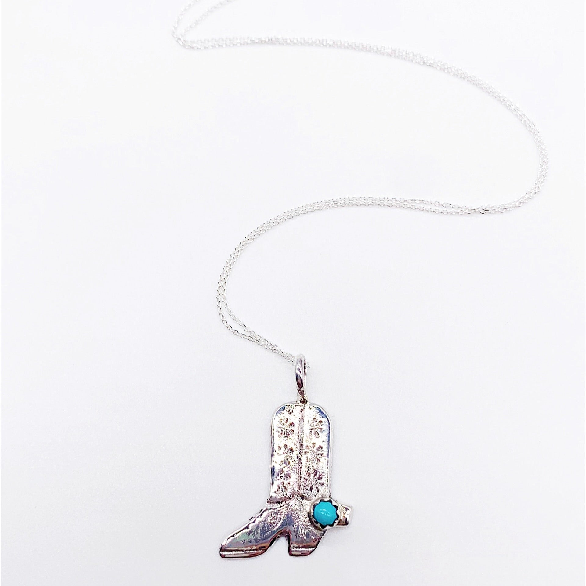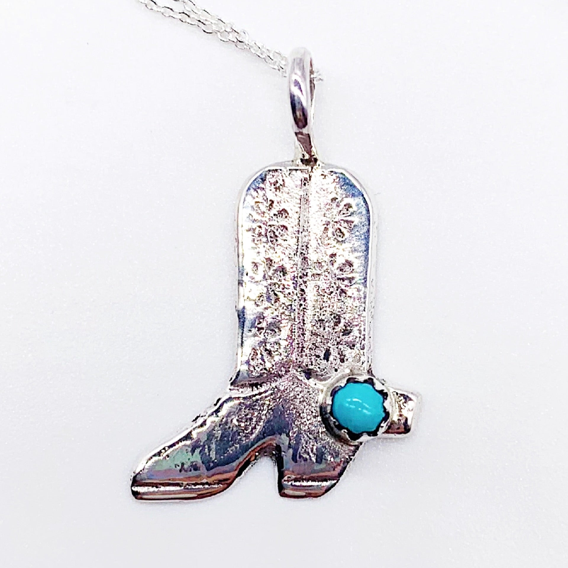 This Navajo handmade sterling silver (.925) necklace features a turquoise cowboy boot pendant with intricate detailing. The pendant is set on an 18-inch sterling silver chain, creating a meaningful piece that reflects Southwestern artistry and tradition.