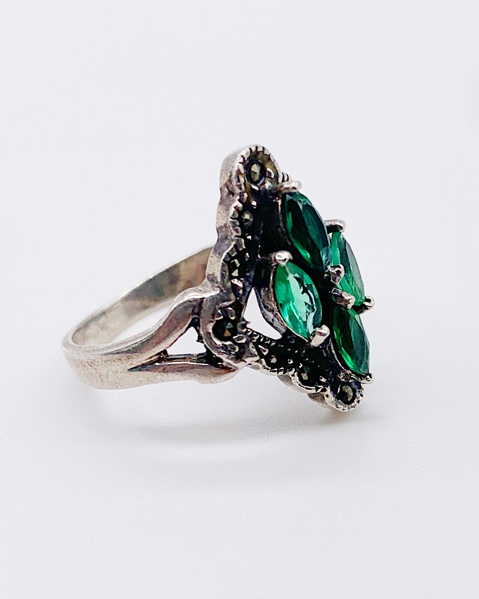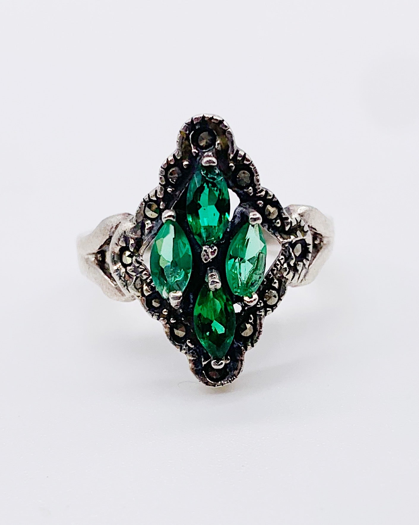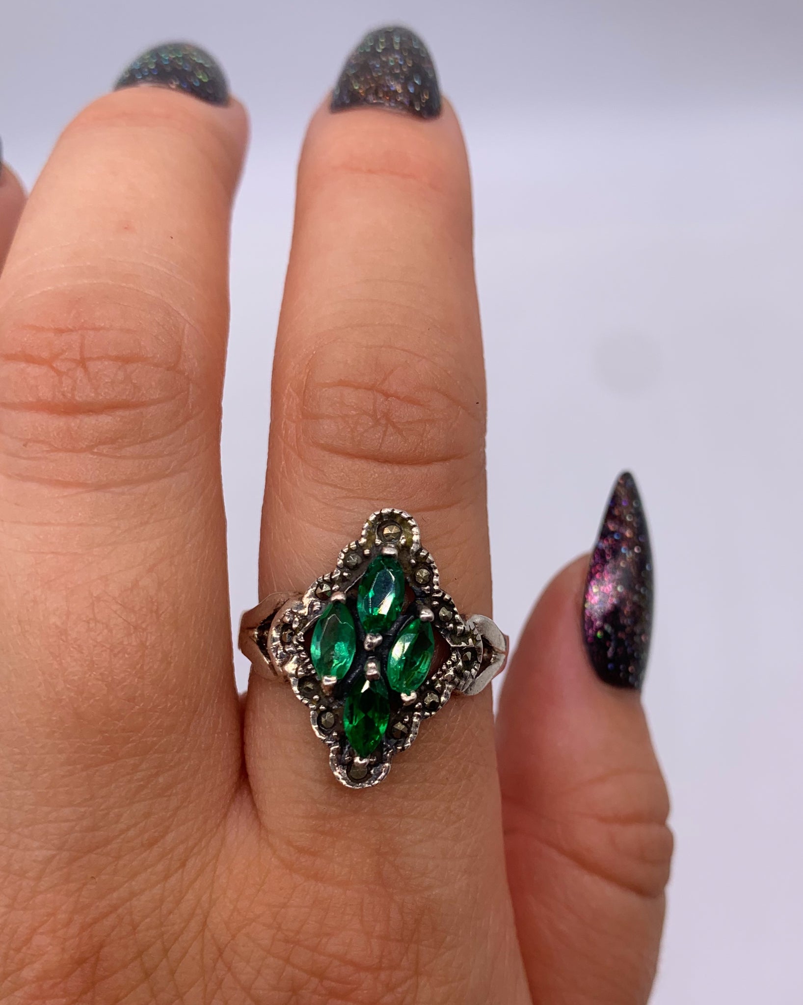 Vintage sterling silver deep green cz cluster ring with detailed marcasite set bezel. Stamped sterling.
