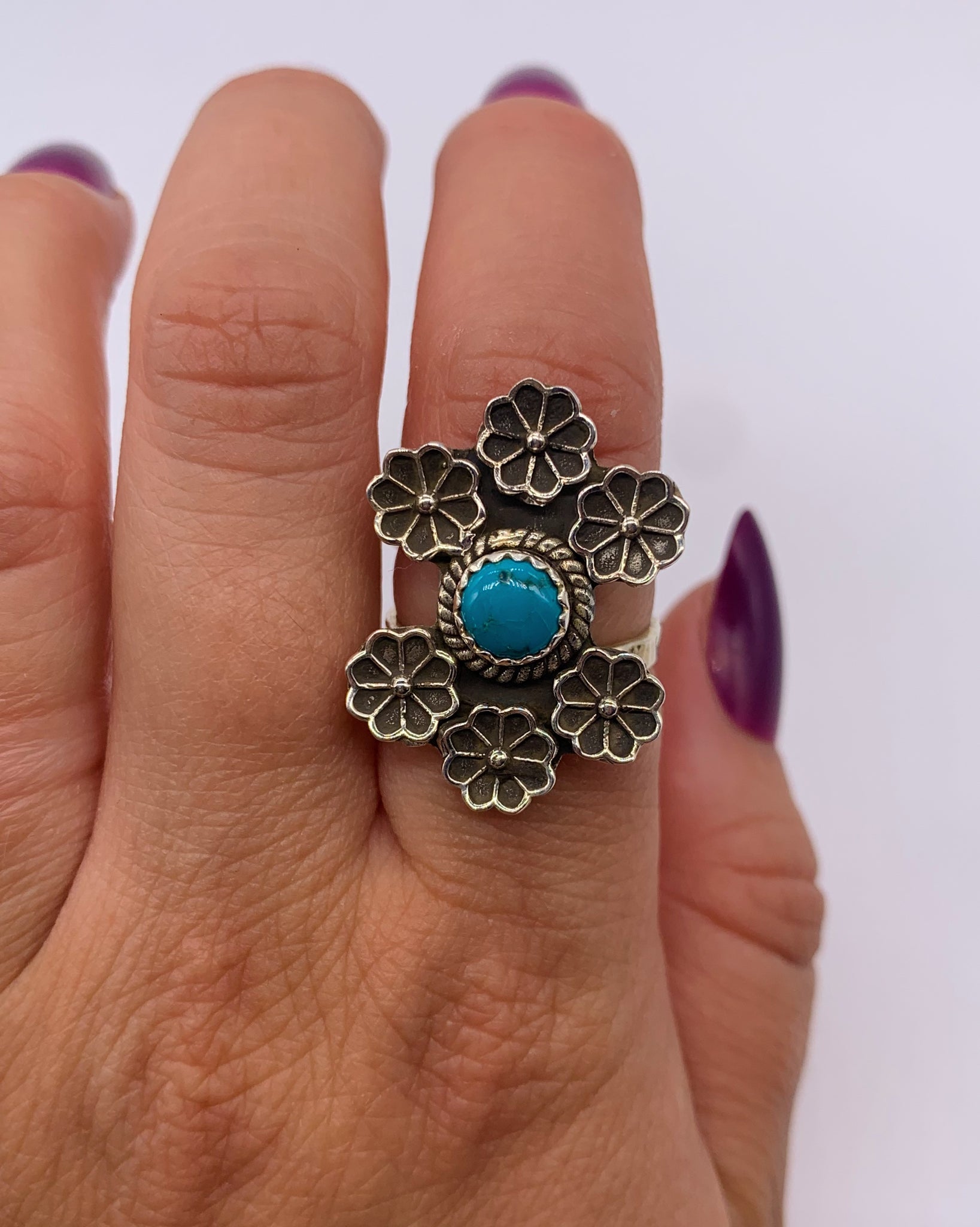 Sterling silver Kingman turquoise ring with detailed encompassing floral bezel with split shank band. Stamped sterling.