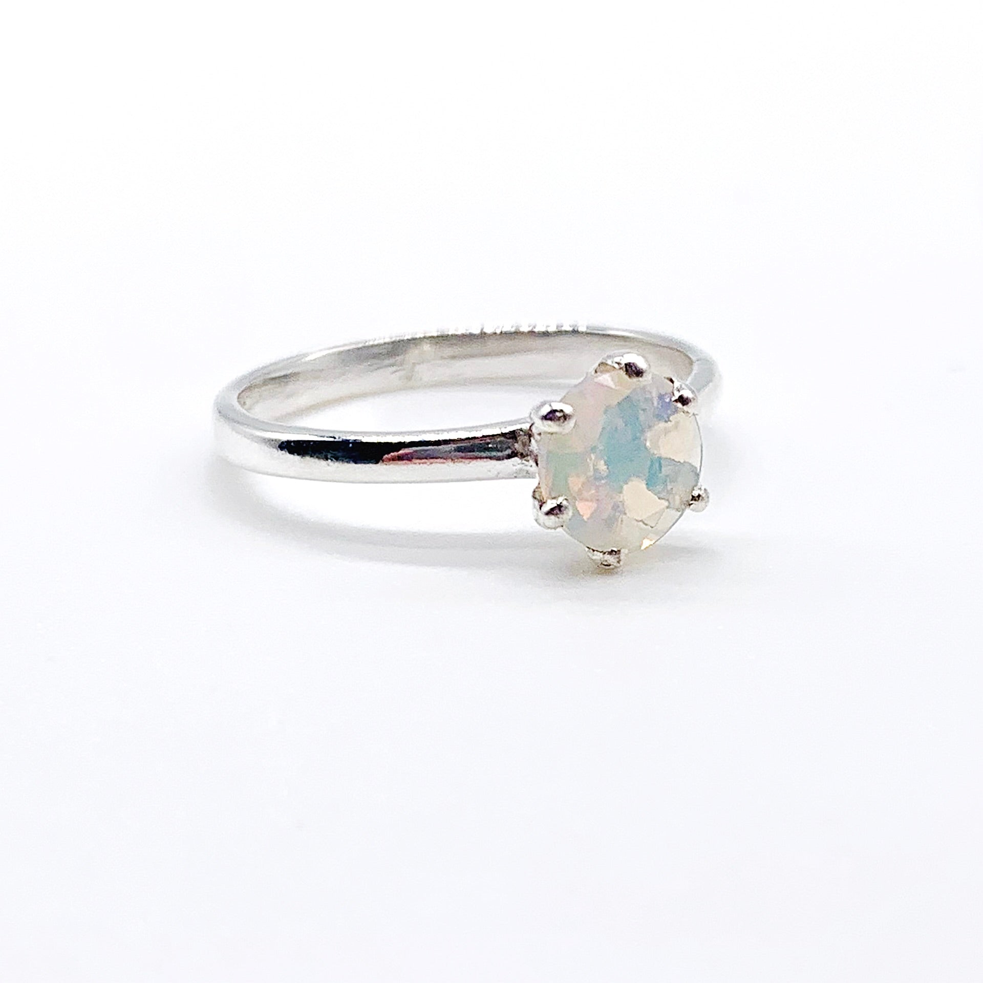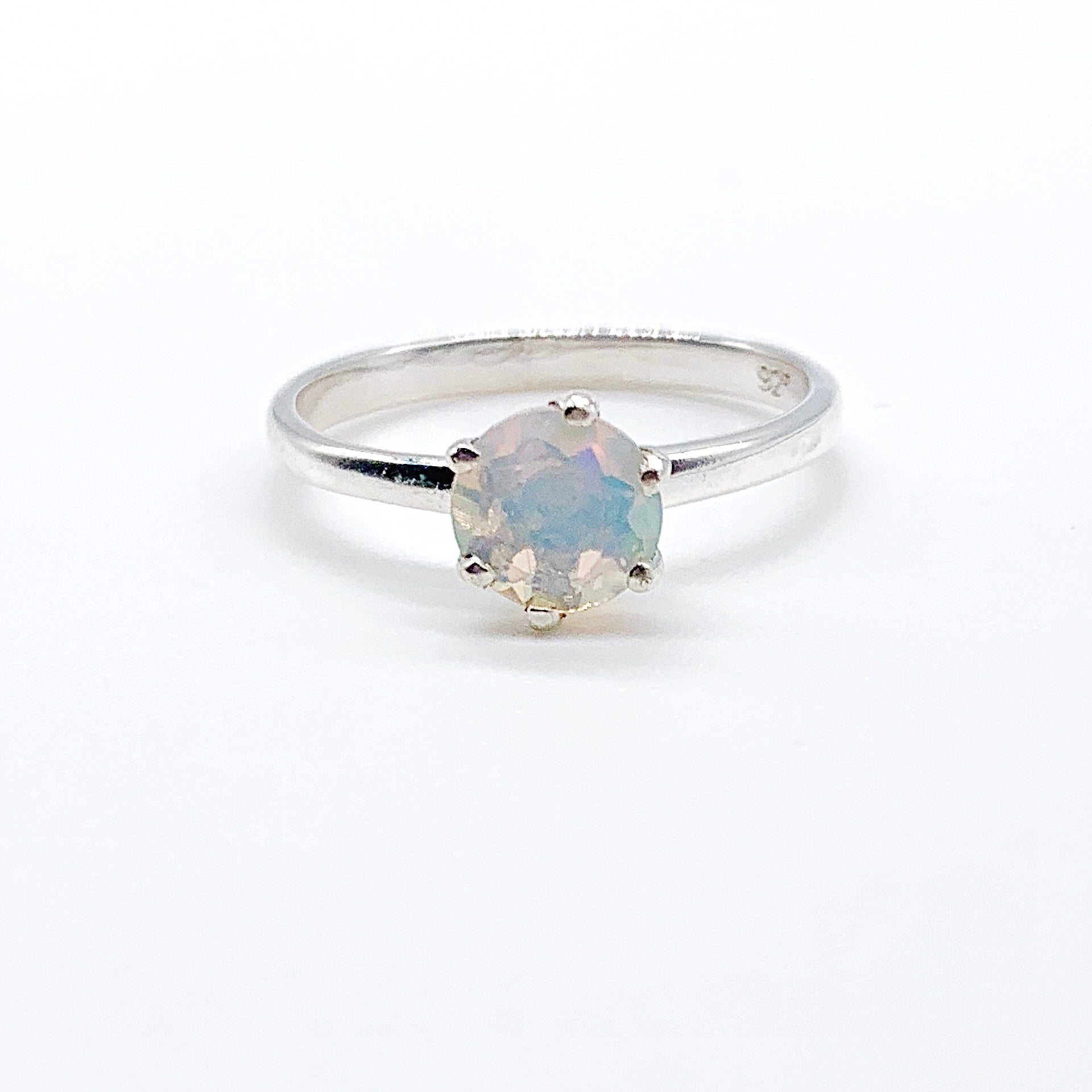 Sterling silver round faceted opal ring with detailed six prong claw bezel. Stamped sterling.
