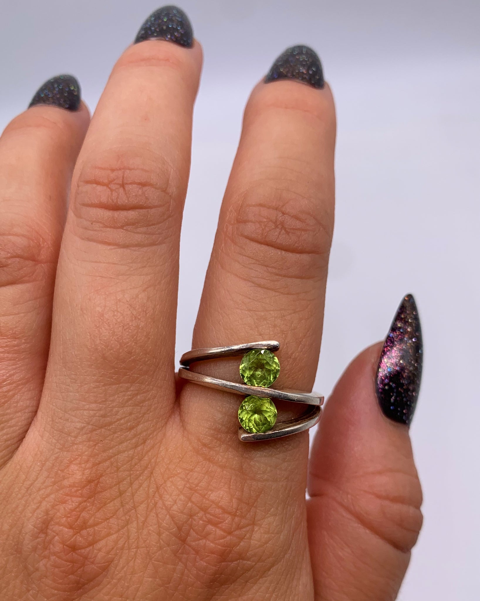 Vintage sterling silver faceted peridot duo ring with split shank band. Stamped sterling.