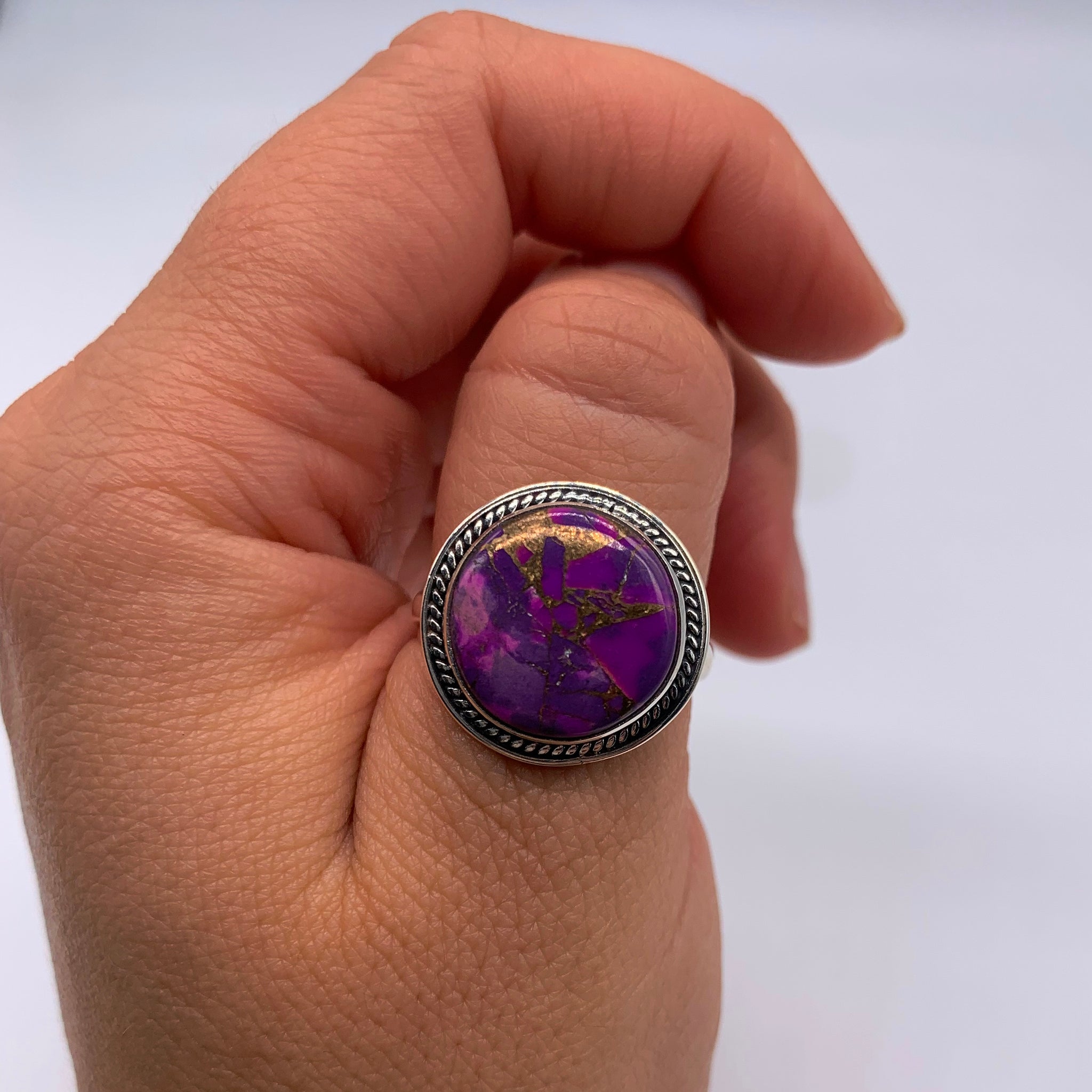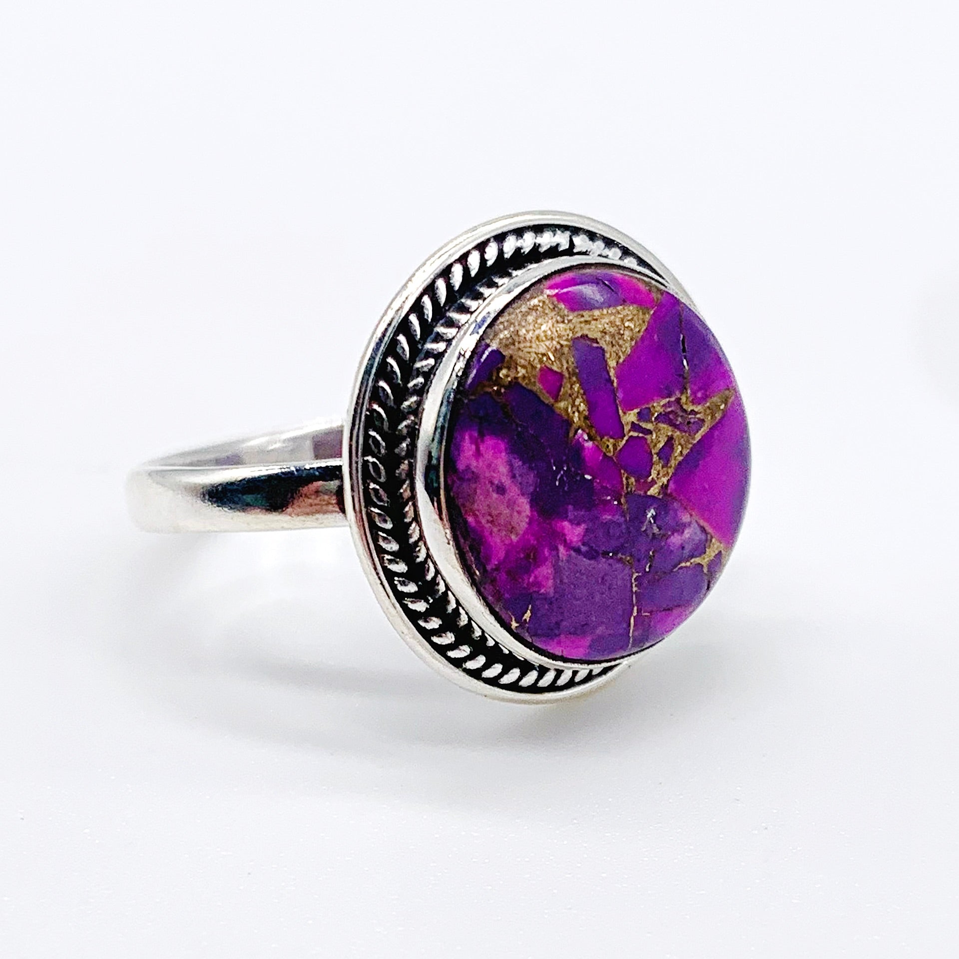 Sterling silver round purple copper turquoise ring with detailed twist wire bezel. Stamped sterling.