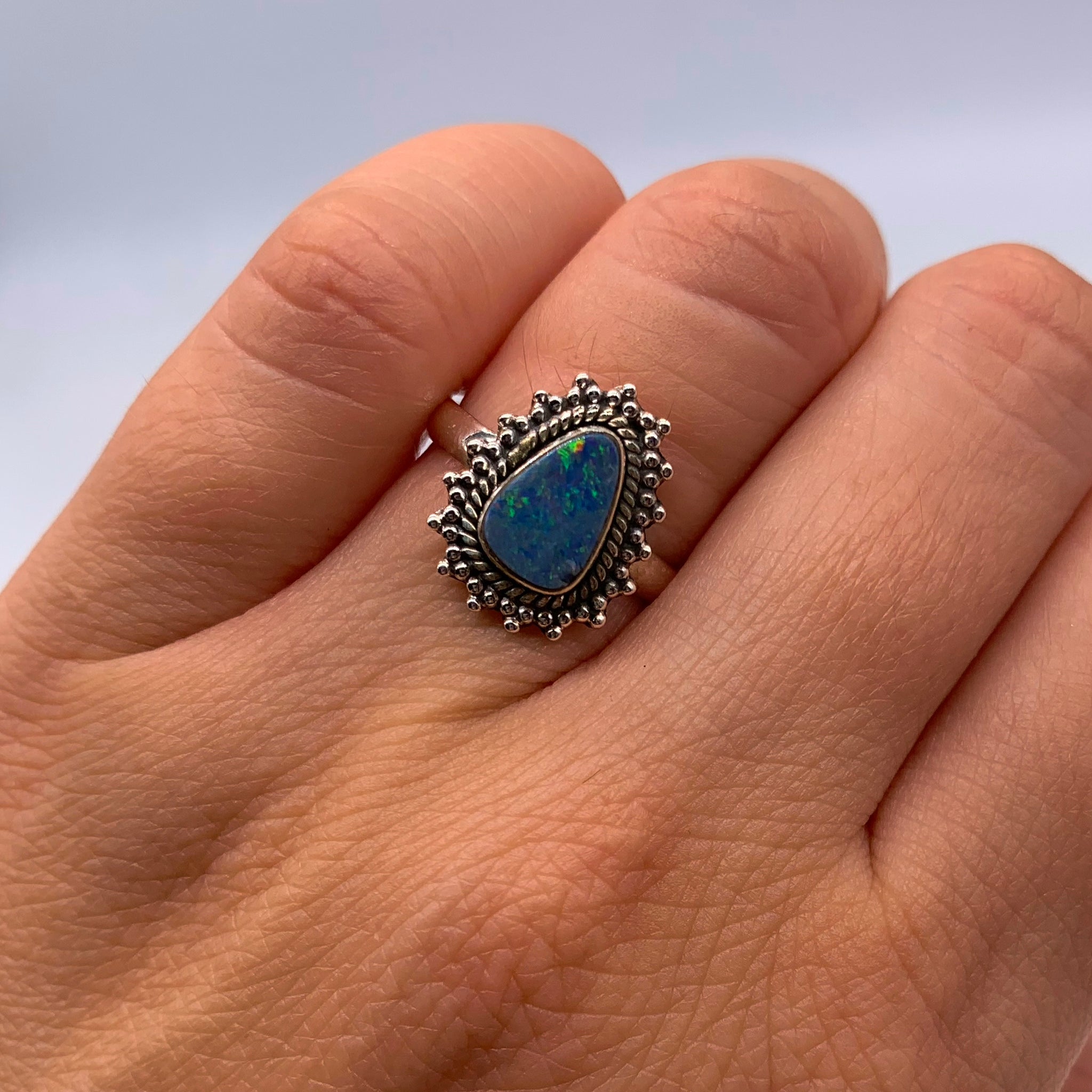 A perfect addition for opal lovers and those who appreciate unique artisan jewelry. Its elegant bezel design highlights the opal’s natural fire, making it ideal for everyday wear or adding a subtle statement to special occasions.