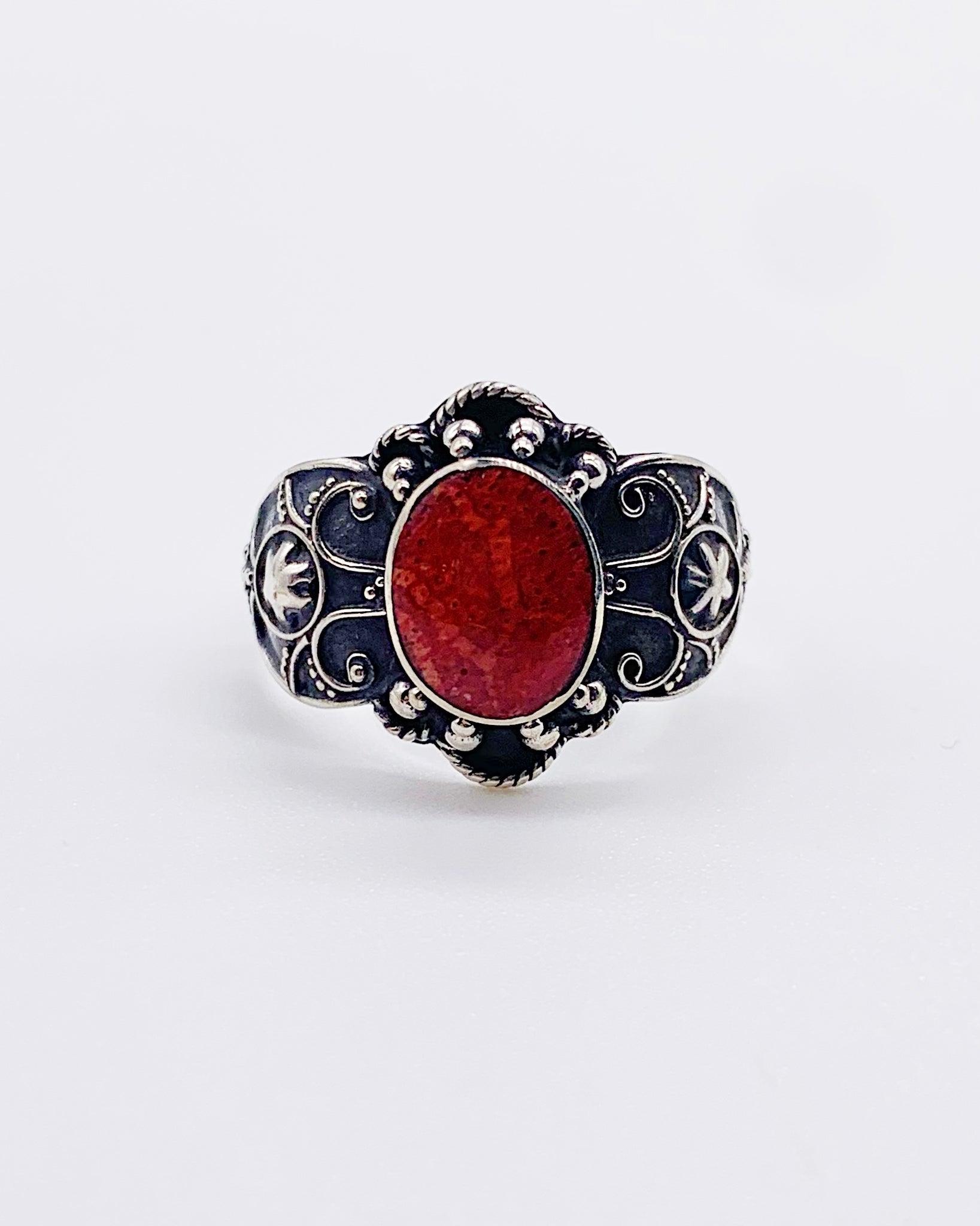 Sterling silver oval coral band ring with detailed filigree and scroll detail. Stamped sterling.