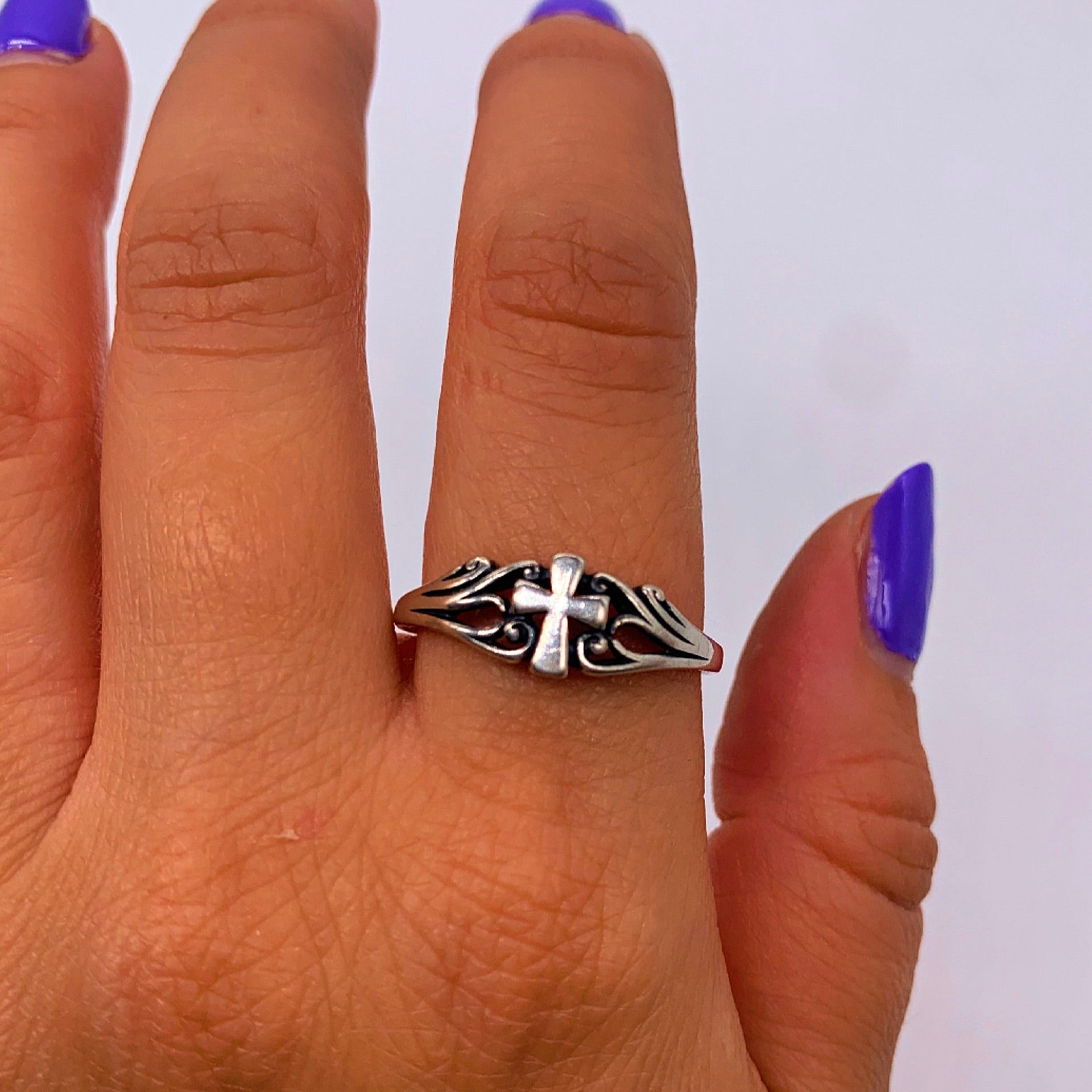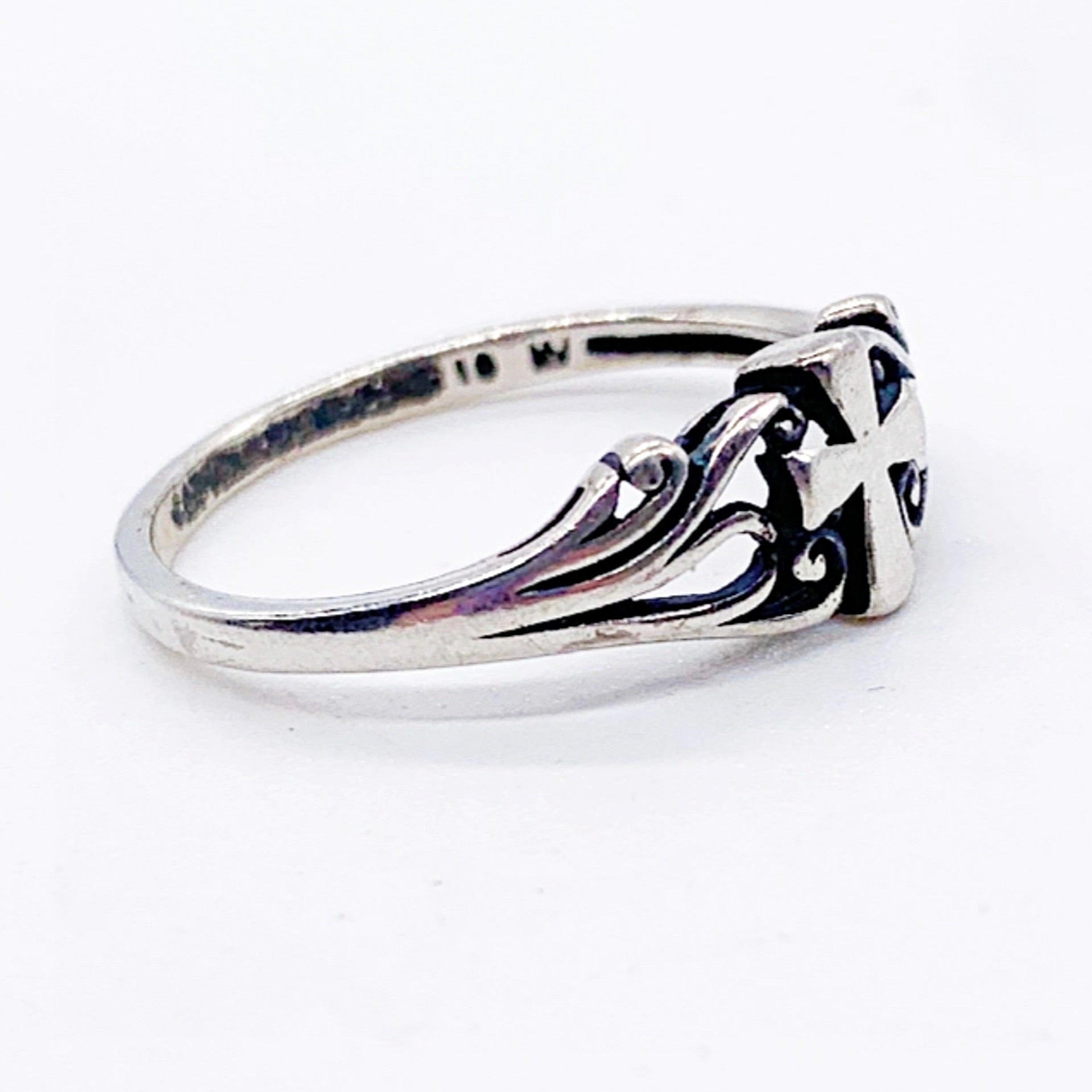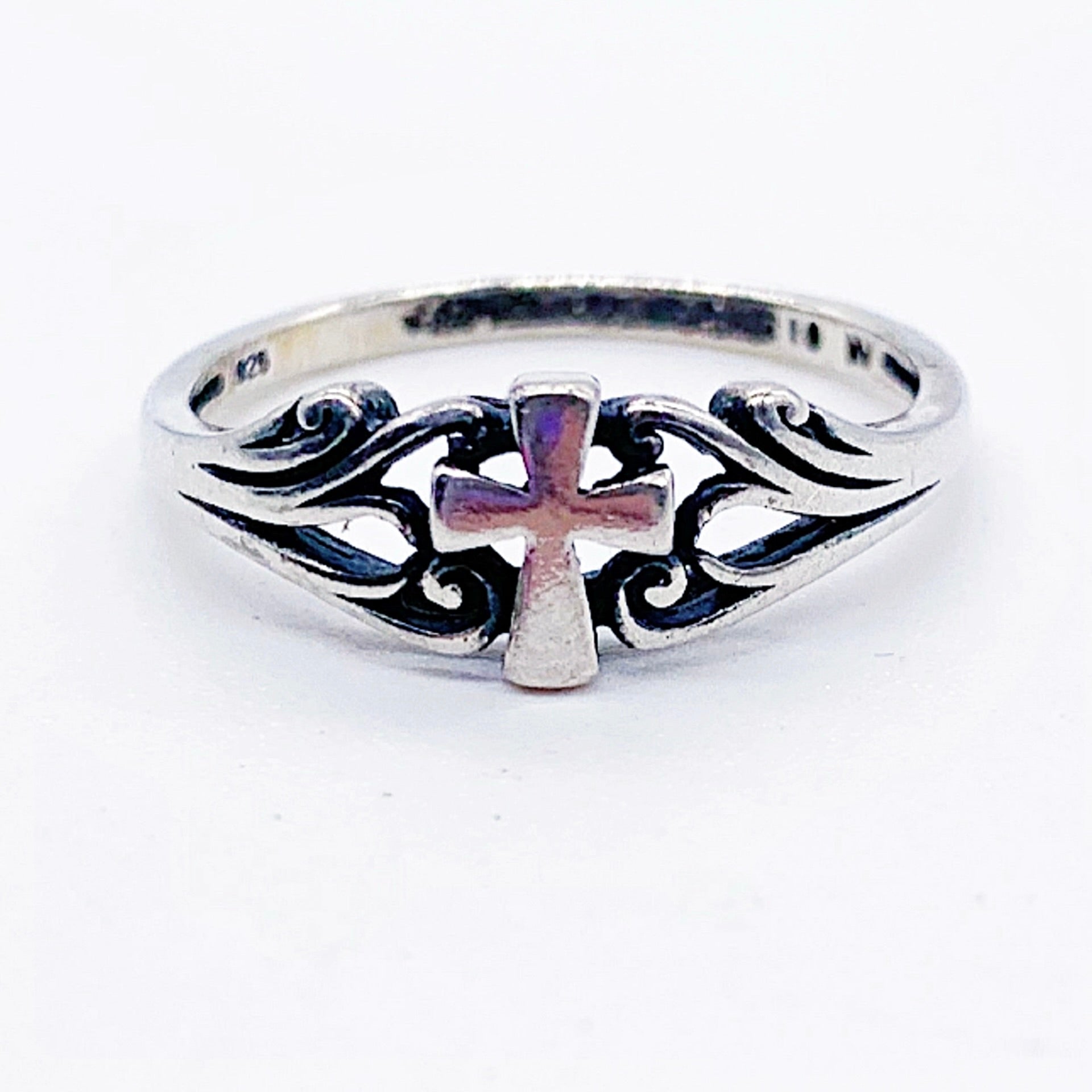 Sterling silver vintage cross band ring with detailed swirl sides. Stamped sterling.