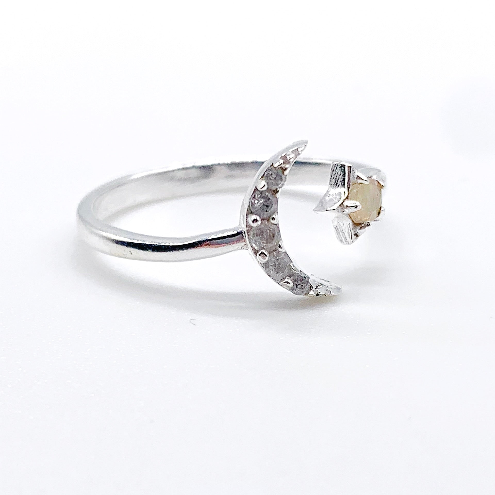 Sterling silver Ethiopian opal and white topaz moon and star band ring. Stamped sterling.