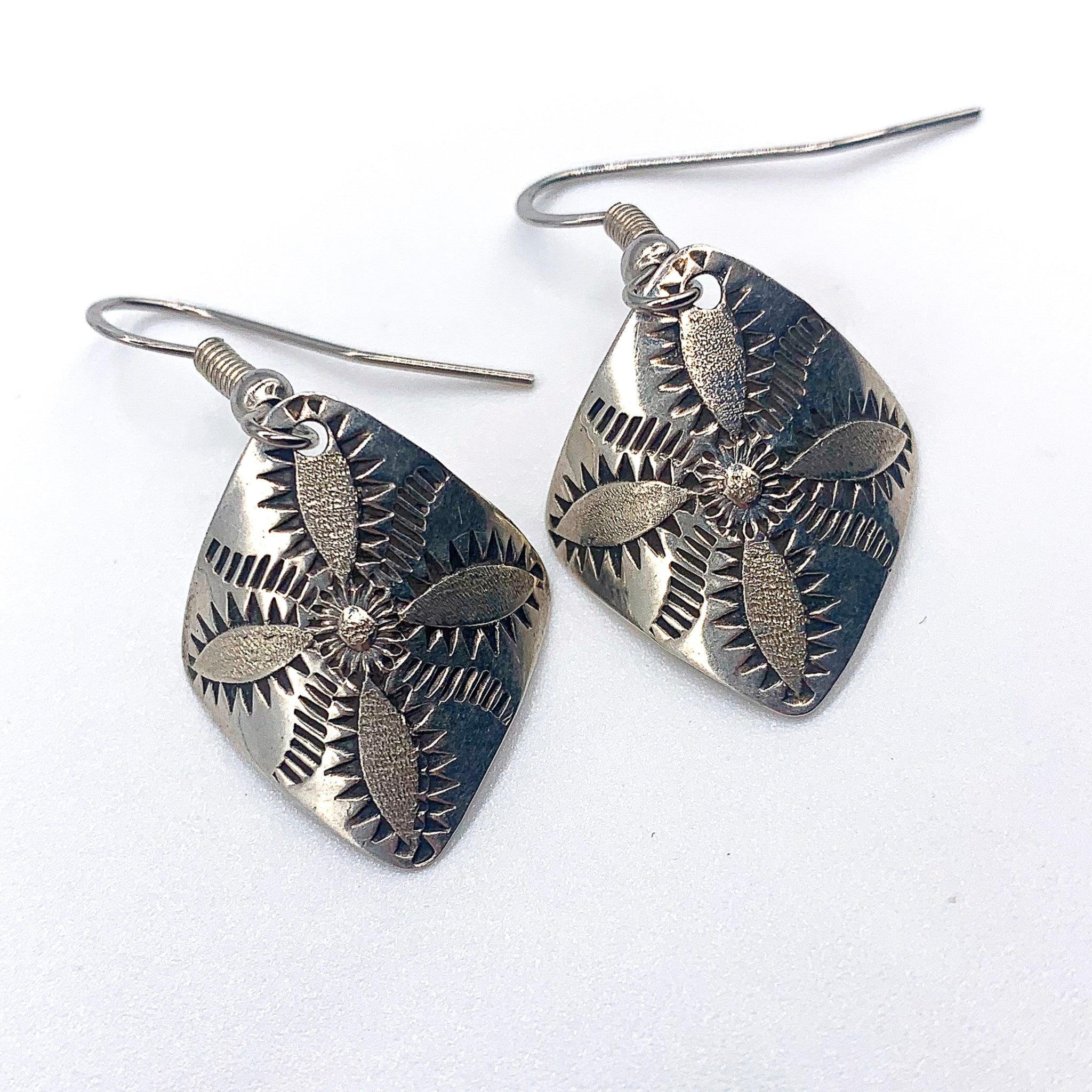Navajo handmade sterling silver etched flower shield drape hook earrings. Stamped sterling.