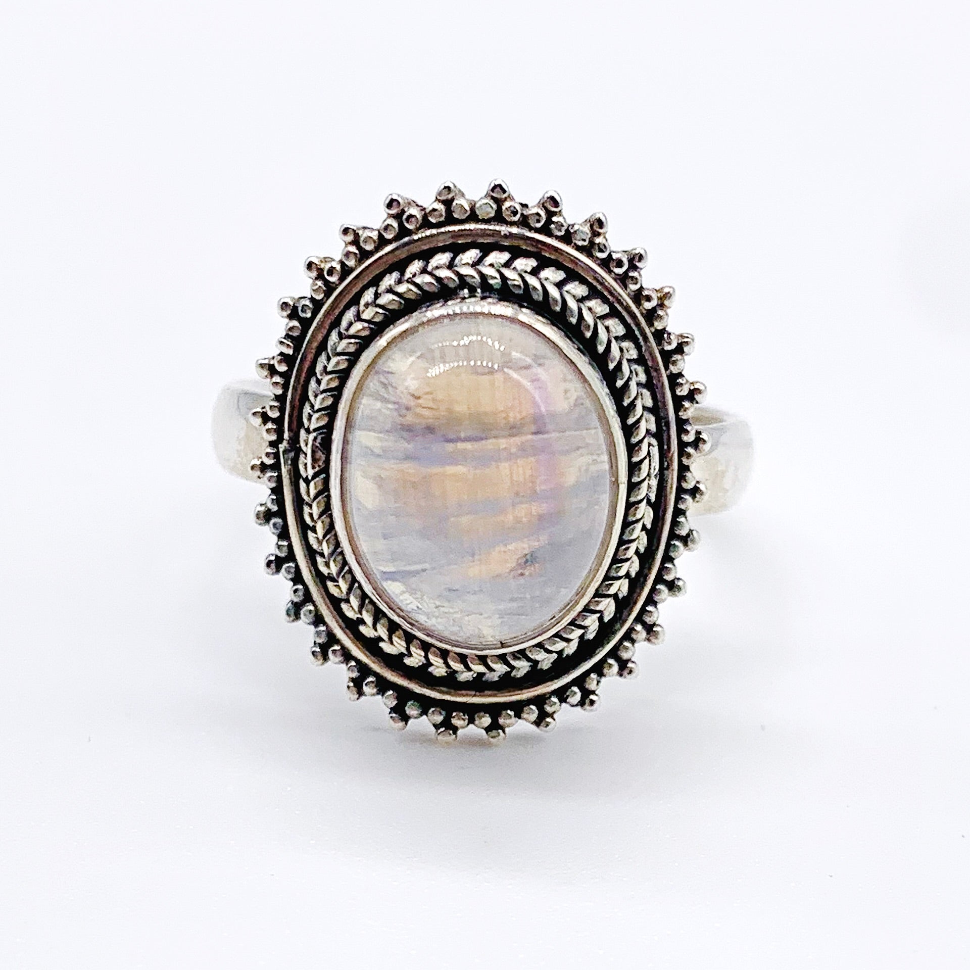 This sterling silver (.925) ring features a luminous oval moonstone set in a smooth bezel, accented with delicate silver drop details that add texture and artisan charm. The clean, elegant silhouette highlights the natural glow of the moonstone, making this piece both timeless and versatile.