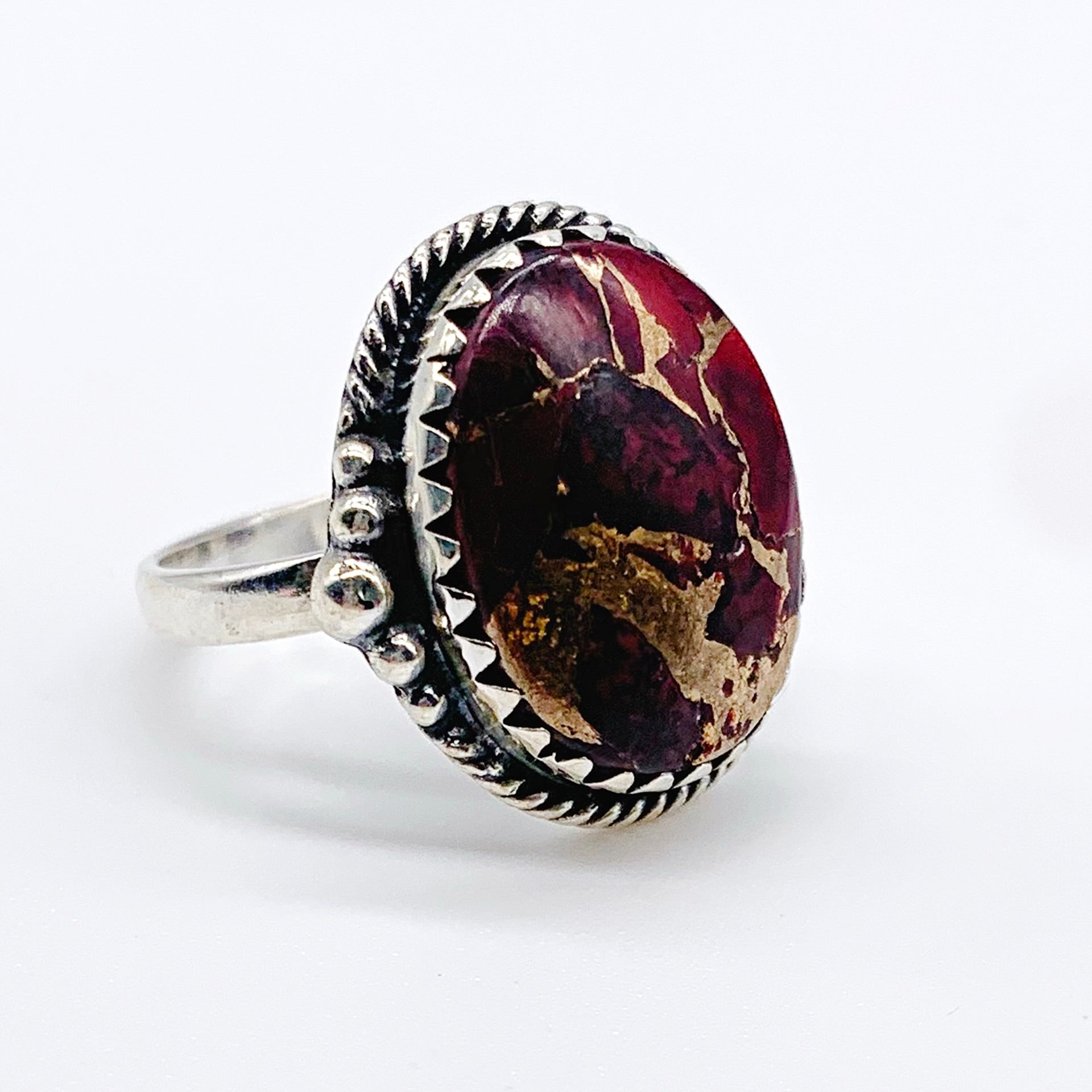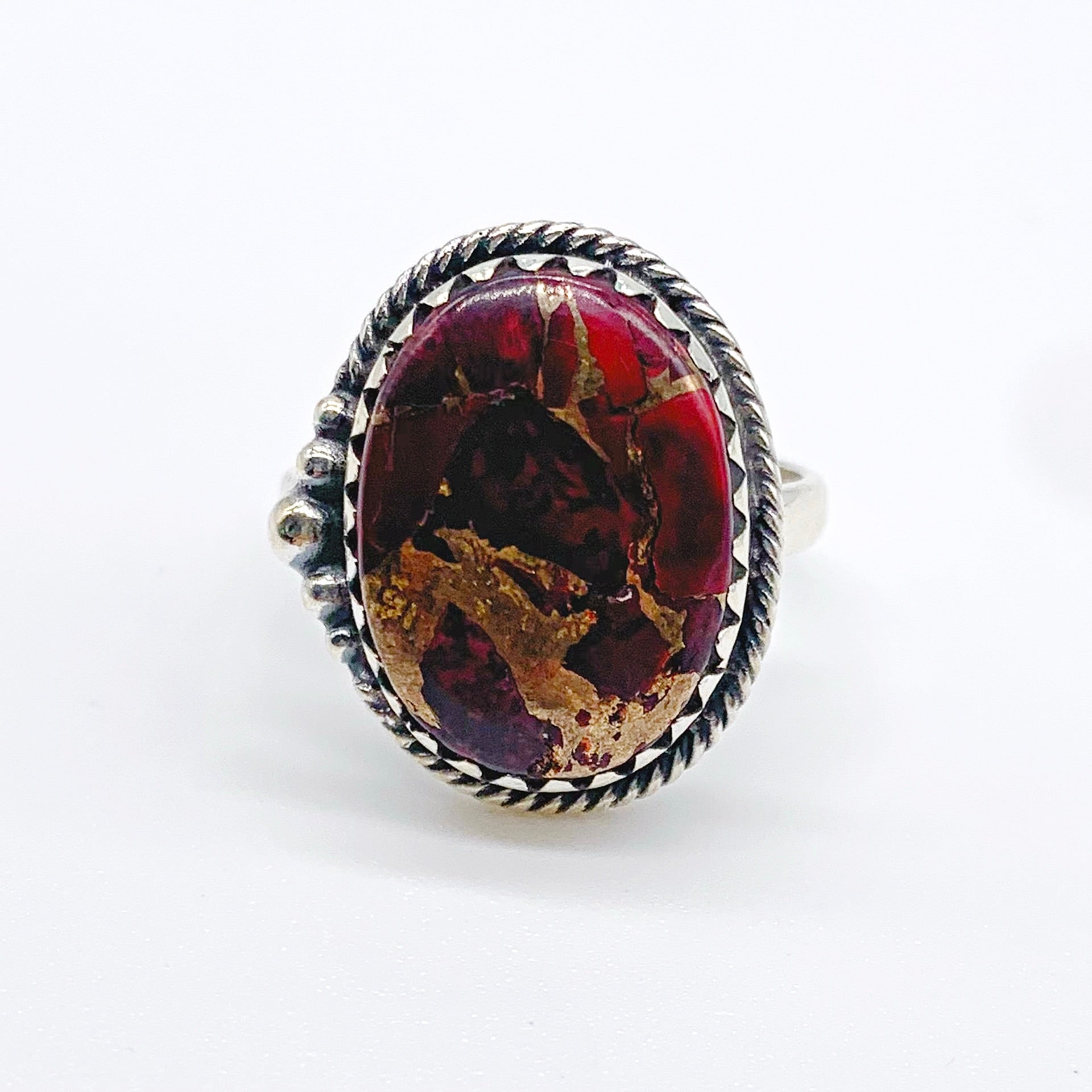 This sterling silver (.925) ring features an oval red rose dahlia turquoise stone set in a detailed twist-wire bezel with decorative side drops. The vibrant stone and classic silverwork create a unique, eye-catching piece.