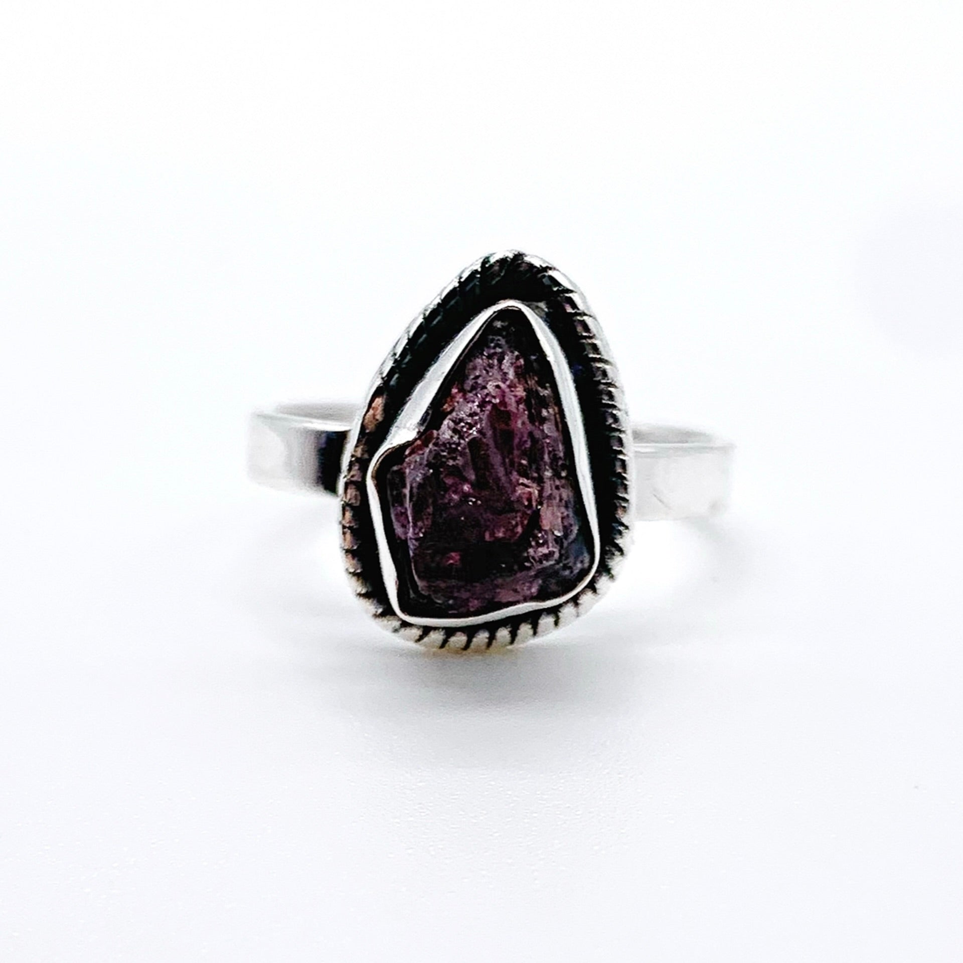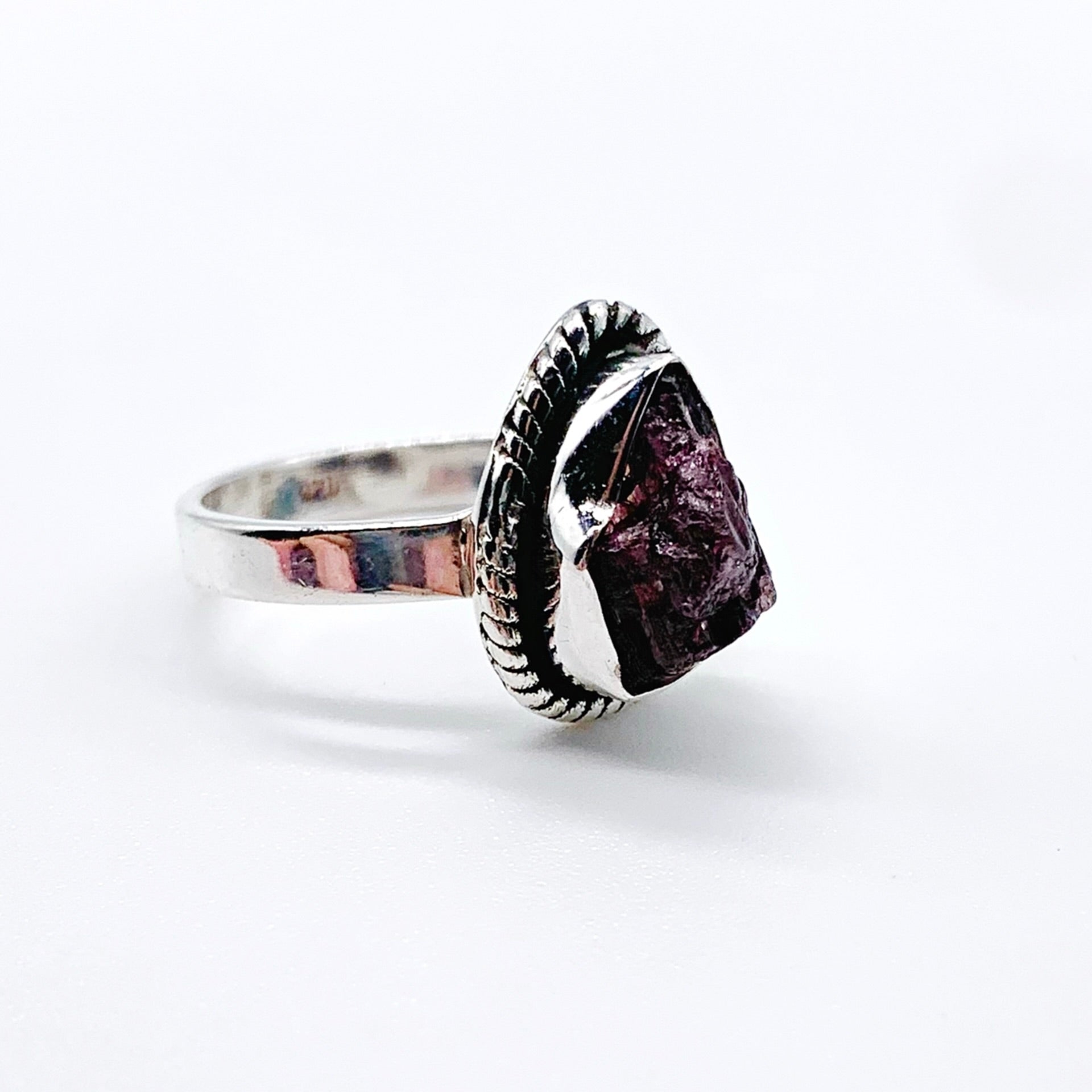 The raw ruby tourmaline offers vibrant natural beauty, while the sterling silver band provides a clean and modern contrast. Perfect for anyone who appreciates earthy gemstones and distinctive, one-of-a-kind pieces.
