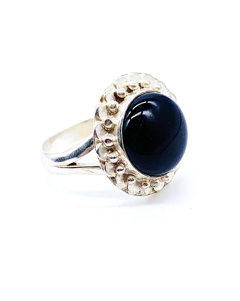 Sterling silver round onyx ring with detailed scalloped petal bezel. Stamped sterling.