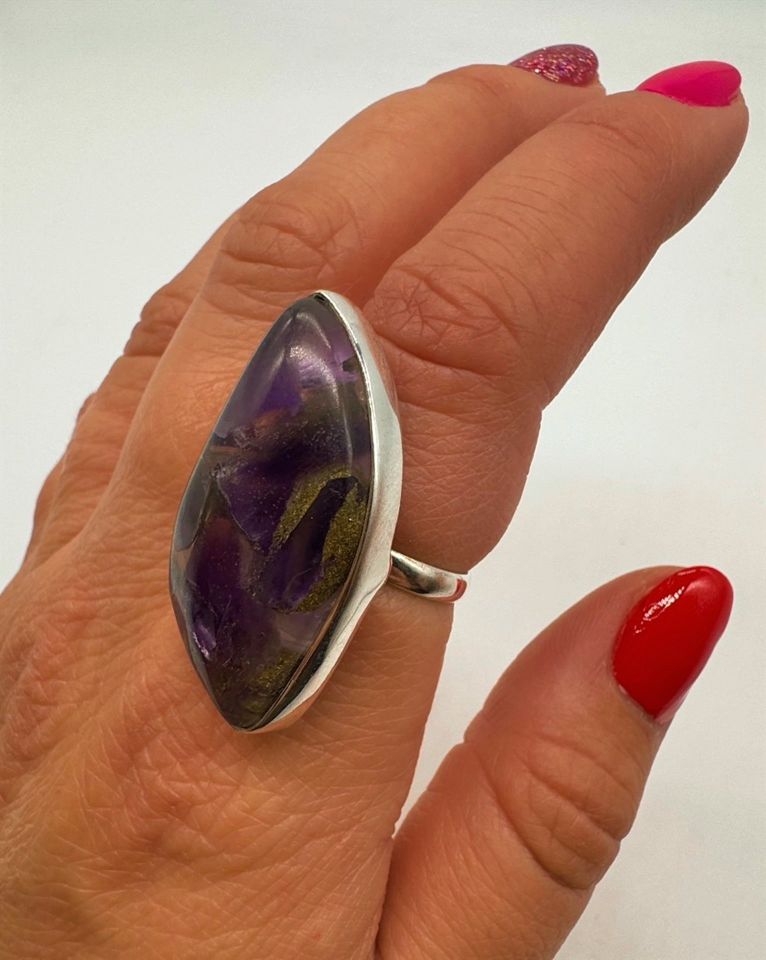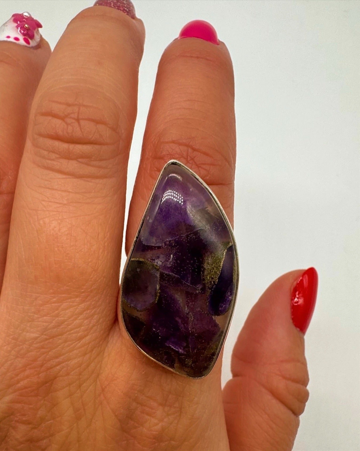 Sterling silver spiny copper amethyst ring with slightly adjustable band. Stamped sterling.