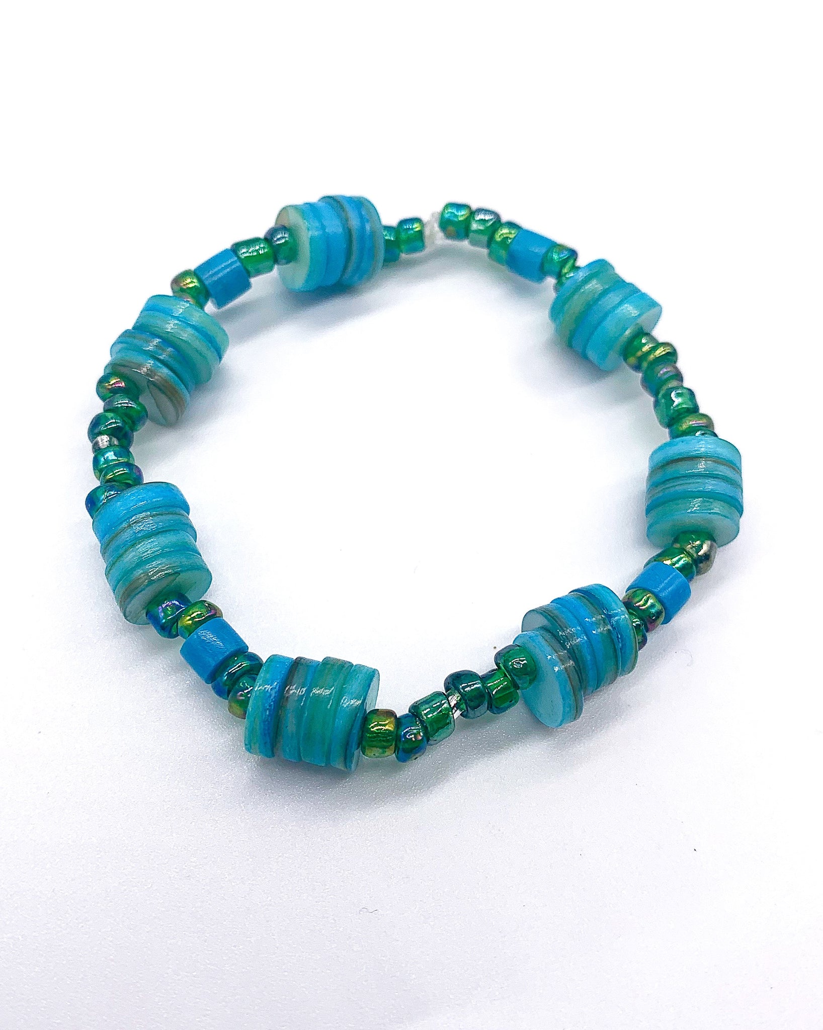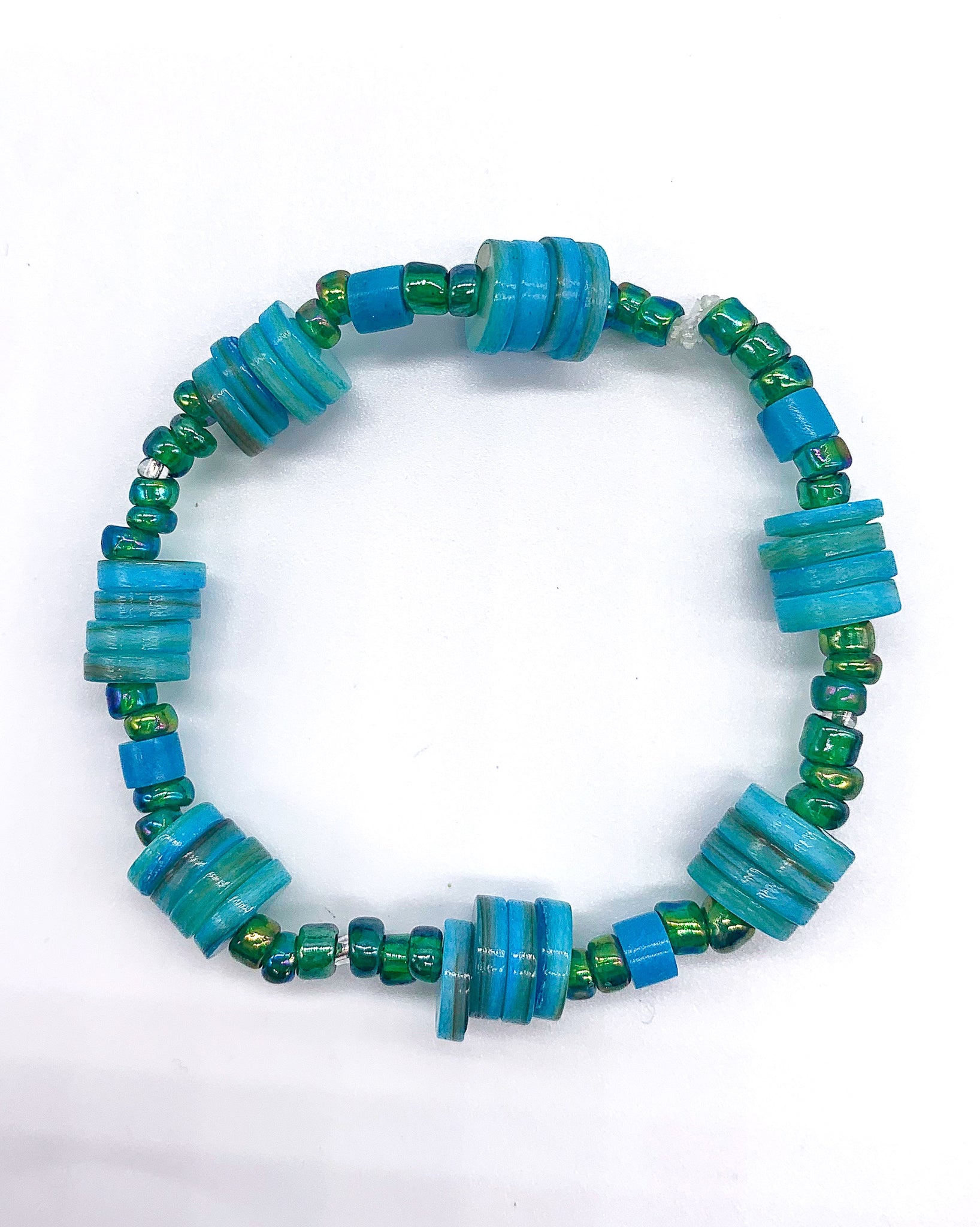 Blue ⋄ made with glass beads, and turquoise shell heishi beads.