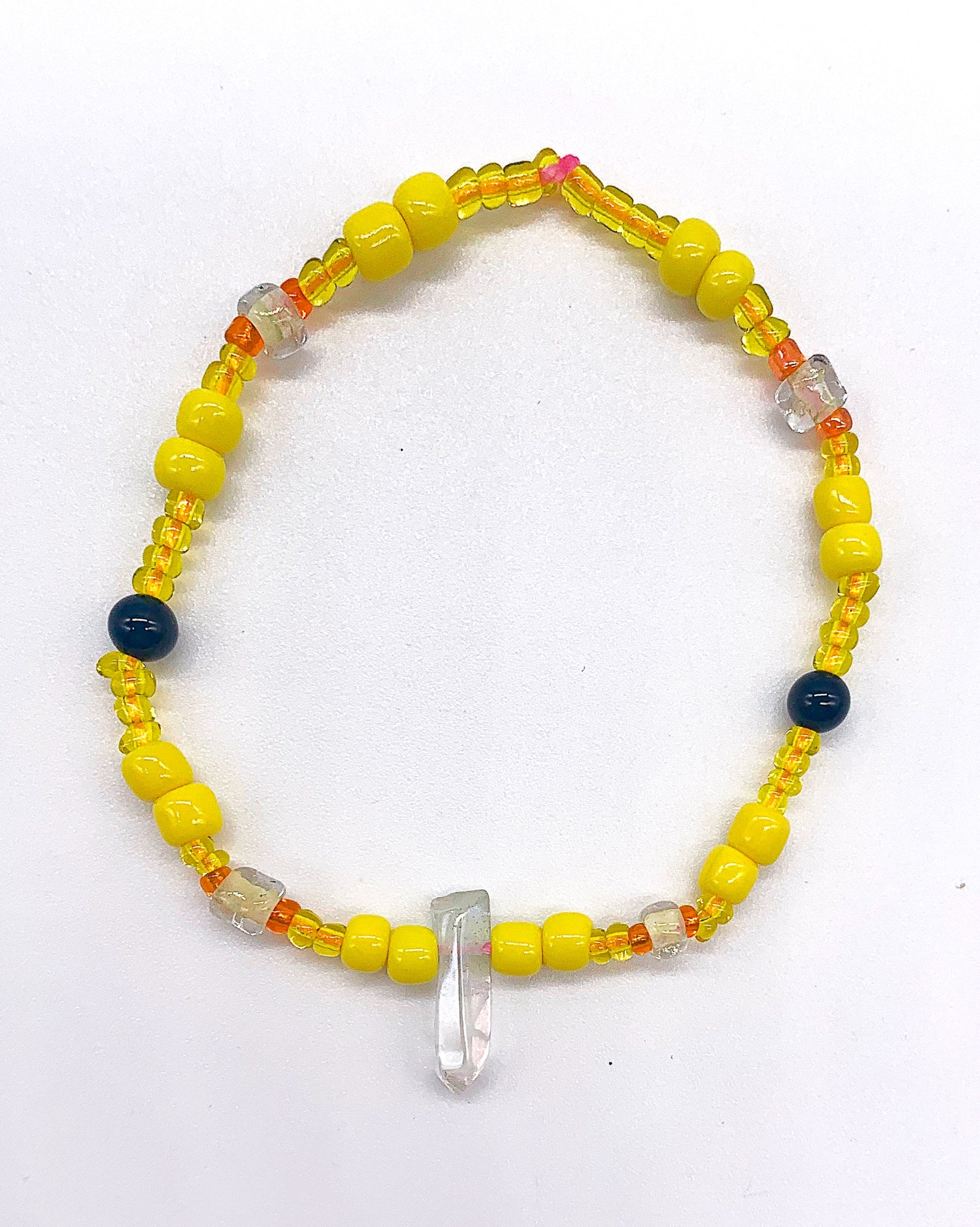 Yellow ⋄ made with glass beads, black onyx stone beads, and rainbow aura crystal.