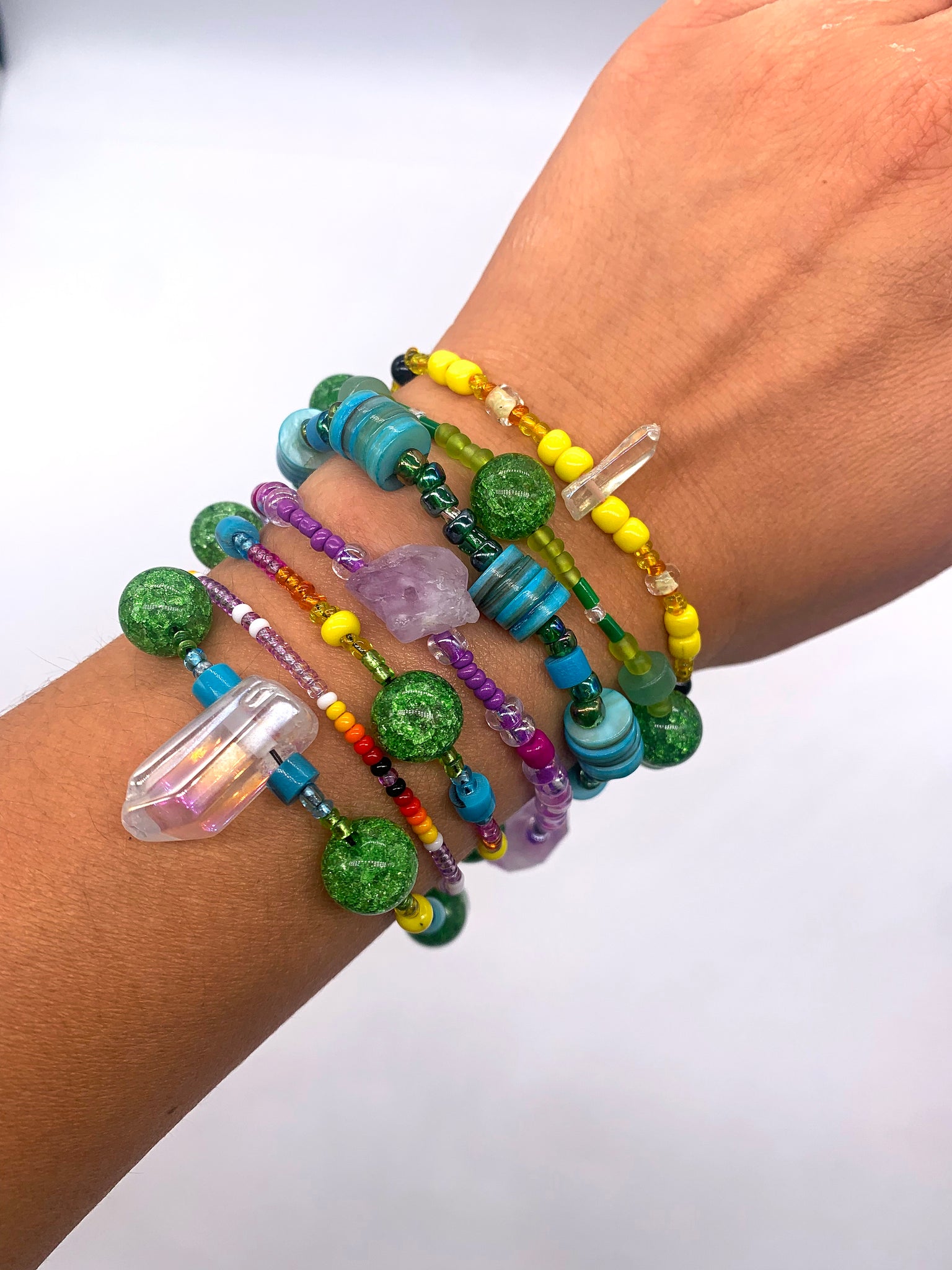 Green ⋄ made with glass beads, green malachite stones beads, aventurine gemstones, and green crackle quartz gemstones.